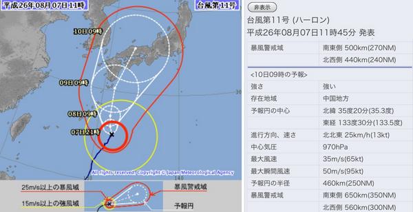 きょう正午の台風11号進路予想。気象庁・米海軍(+9時間で日本時間)ともほぼ一致。10日9時、中国地方にある時点の中心気圧は970hPaと強い勢力の予想。接近前もあす以降は再び大雨、土日は暴風や波浪、高潮など広島も要警戒な状況に pic.twitter.com/CKnEatu2fq