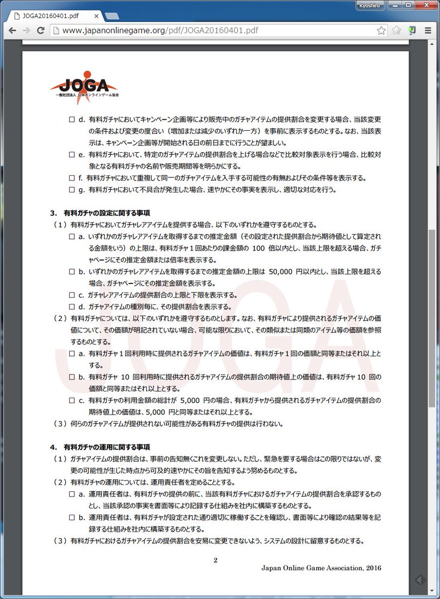 ひどいザルのソシャゲ業界ガイドラインというのはこれか。 今度の4月付けの改訂でこれってのがなぁ…。>JOGAガイドライン japanonlinegame.org/pdf/JOGA201604… pic.twitter.com/bMJpbHD9e3
