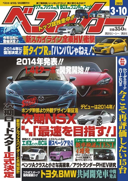 ベストカー3/10号はいつもより一日早い2月9日発売です。スクープではスカイラインHV、シビックタイプR、NSX、次期ロードスター&アルファスパイダーに迫ります。新車コーナーではクラウン&アウトランダーPHEVをテストします!! pic.twitter.com/Kq9jXS2M