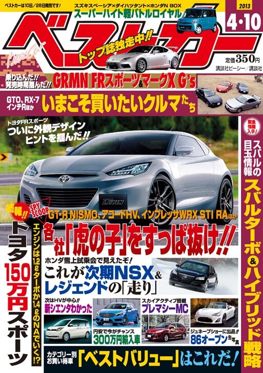 ベストカー4/10号は、いつもより1日早い3月9日発売です。スクープではトヨタの150万円FRの新情報を掲載。さらに次期NSXに搭載される予定のホンダのハイブリッド4WDを雪上でテスト! ジュネーブ登場の86オープンにも迫ります! pic.twitter.com/c0A7siTtPk