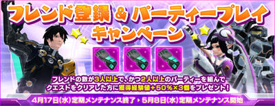 【キャンペーン】5/8 メンテナンス開始までに、登録フレンド数が3人以上で、かつ2人以上のパーティーでクエストをクリアした方全員にアイテムをプレゼント! pso2.jp/players/news/?… #PSO2 #フレンドPT01 pic.twitter.com/hIDp2BzqlB